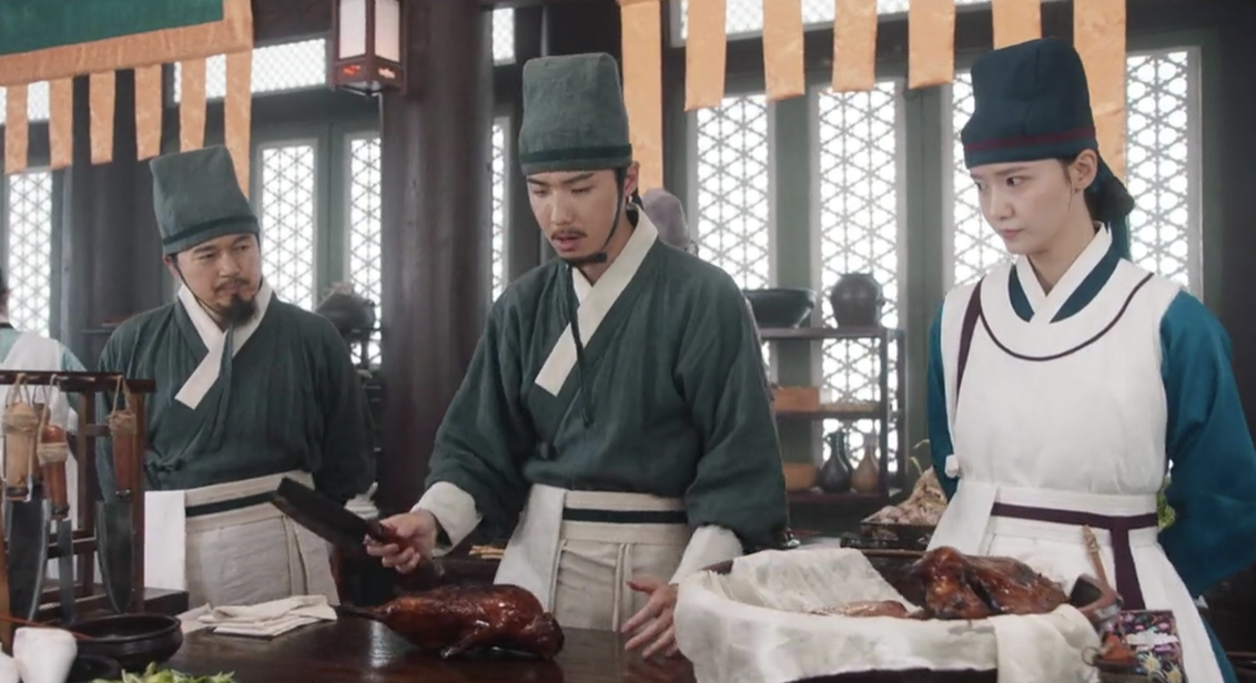 When Round Two begins, the Joseon team roasts the duck, but Chef Maeng, shaken by Consort Kang’s threat, intentionally slips and cuts his own hand. With Ji-young still injured, Gil-geum steps up. It turns out Maeng has been training her relentlessly for exactly this moment, and Ji-young had already pieced together that Consort Kang was manipulating him.