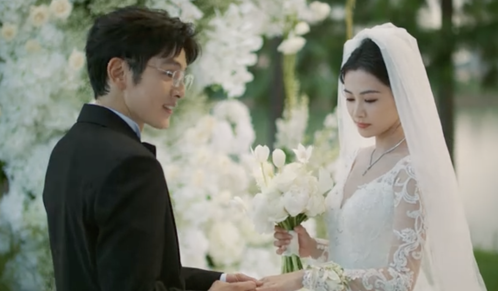 Hu Xiu approaches the bride, Wang Yue, with sincere congratulations, trying to keep her composure despite everything weighing on her heart. But when she casually comments that a “flash marriage” takes courage, the mood shifts. Wang Yue is genuinely confused and explains that she and Zhang Qiran have known each other for over a year and dated for six months before tying the knot. The realization hits hard, Hu Xiu has unknowingly stepped straight into a lie built on her own heartbreak. She quickly changes the subject, but the damage is done.