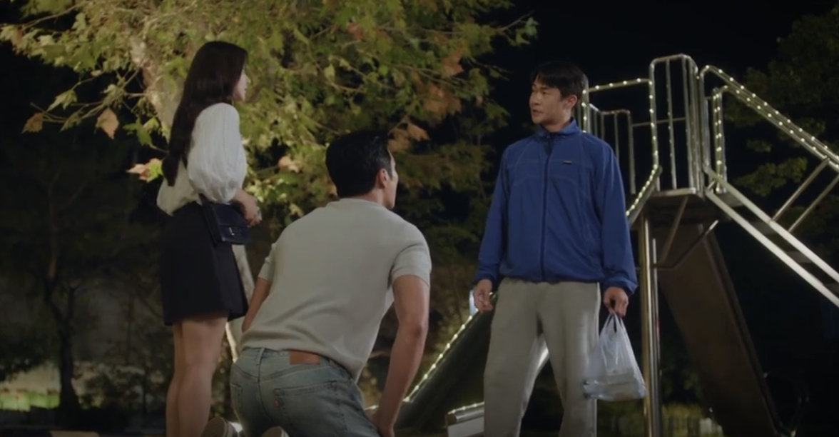 We finally get clarity about the mysterious woman who sparked so much jealousy earlier. She turns out to be Jae-gyu’s sister and Han-gyul’s mother, not a romantic rival at all. But instead of clearing things up properly, Jae-gyu chooses the easy route and vaguely explains her away as a strict insurance agent he once met for work. Bom hesitates, clearly unsure, but ultimately decides to accept his explanation. It’s not perfect honesty, but it shows how new and fragile this relationship still is.
