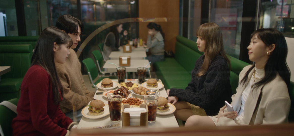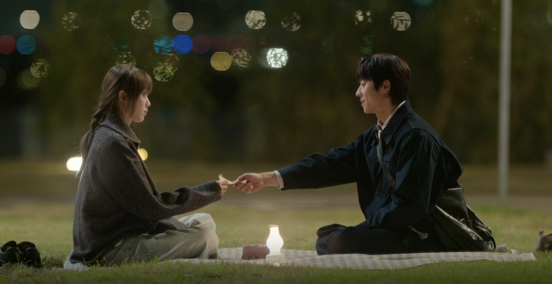 Sensing her shift in mood, Chan gently changes course. He hands off their fried chicken to another group and instead brings over bikes, suggesting they ride across the bridge. The change works. With the wind in her hair and a new setting around her, Ha-ran finds herself smiling again, even with the weight of old memories lingering in the background.