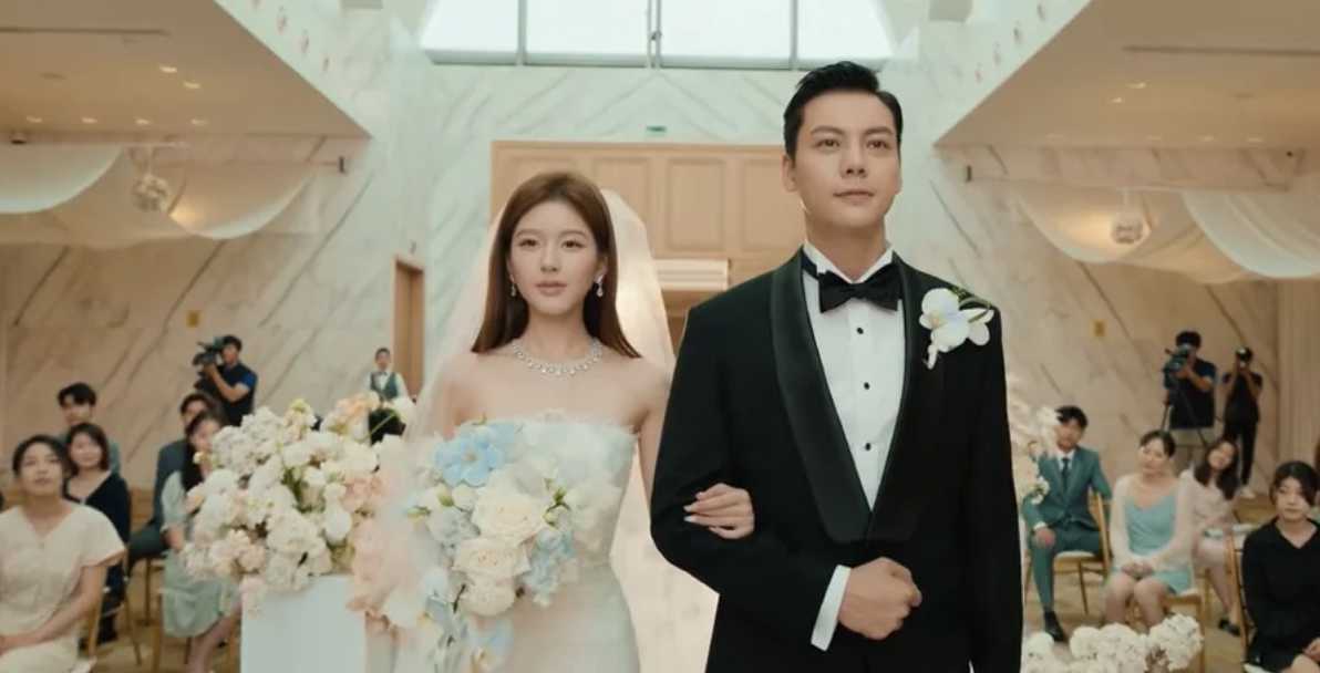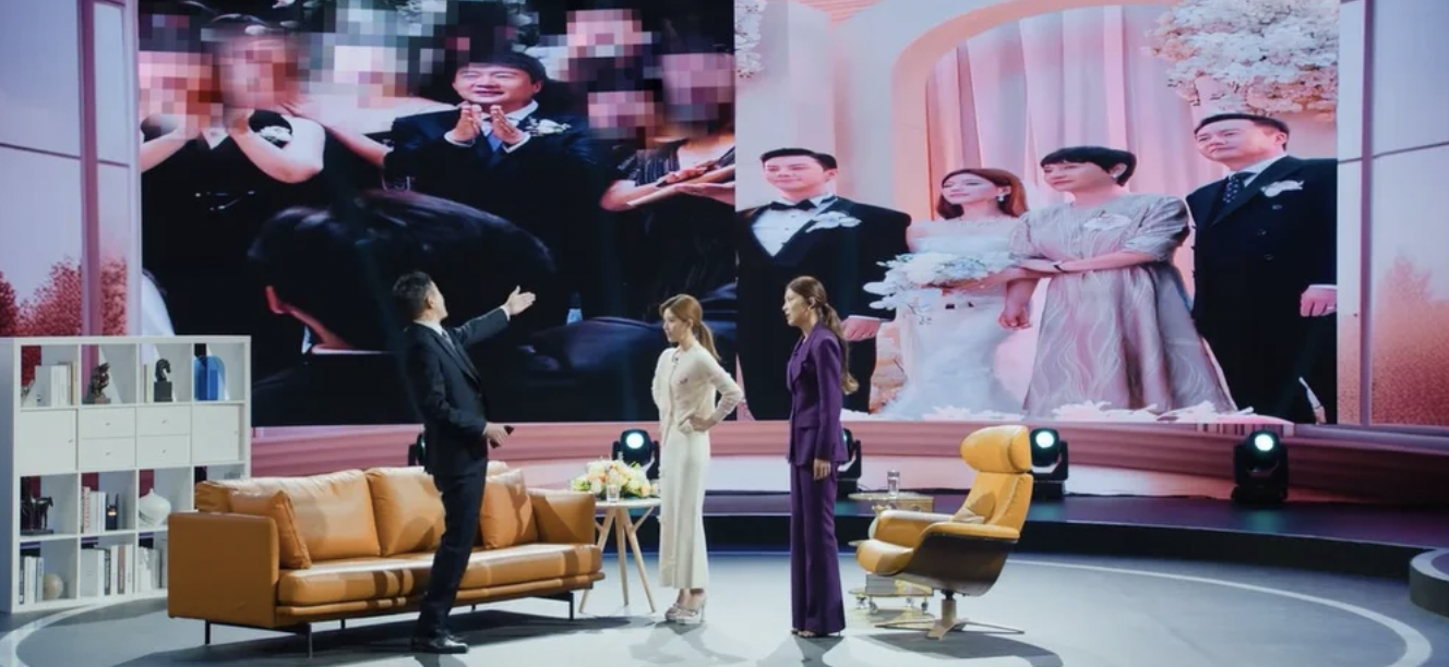 Wedding day. Venue straight out of a travel-influencer fever dream. Xu Yan’s old classmate’s parents recognise her, threaten to blow cover, so Fake Dad executes Operation Red-Wine Spill, problem solved, dry-cleaning bill pending.
