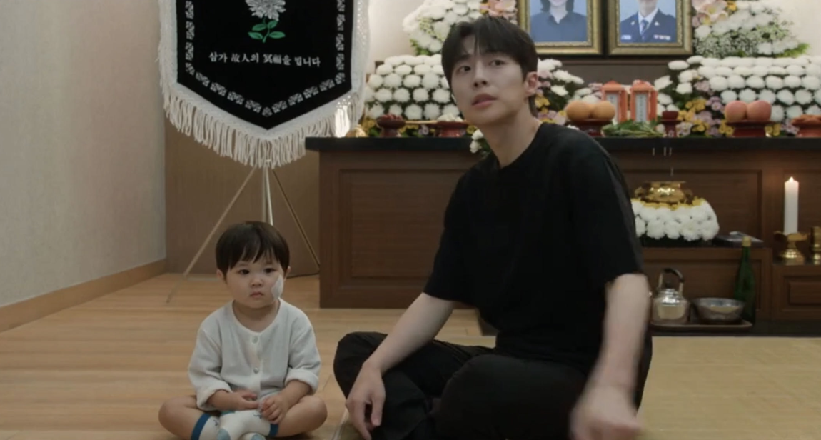 And then tragedy strikes without warning. Woo-jin learns his father is being released from prison. He and Hyun-joo get into the car, and a truck collision takes both their lives. The shift in tone is devastating. The funeral scenes are heavy with silence and disbelief. Hyun-jin’s grief is palpable. Tae-hyung arrives too, and it is there that he meets Woo-joo, the little boy who has just lost everything.